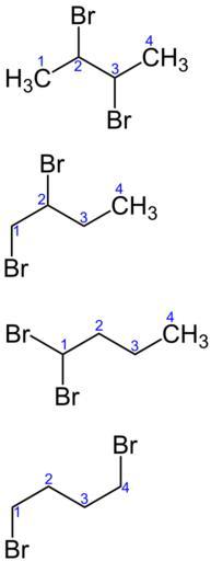 Keywords: Dibromo butane Structural Formulae V.1.svg en Dibromo_butane_Structural_Formulae de Dibrombutan_Stellungsisomere ohne Stereochemie own Jü 2010-10-30 Isomerism Bromobutanes
