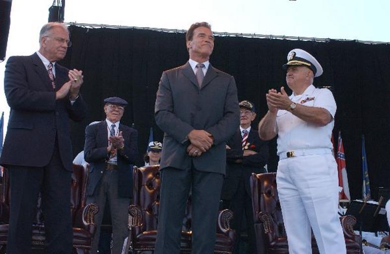 Keywords: Dick Murphy, A. Schwarzenegger and Ron Ritter, 2005.jpg San Diego May 29 2005 “ From left San Diego Mayor Dick Murphy California Gov Arnold Schwarzenegger and Cmdr Ron Ritter applaud World War II veterans during a 60th anniversary commemoration ceremony of World War II The ceremony was organized by the Department of Defense World War II 60th Anniversary Commemoration Committee to pay tribute and recognize World War II veterans for their outstanding service and sacrifice during the Memorial Day weekend www navy mil http //www navy mil/view_image asp id 24903 2005-05-29 U S Navy photo by Photographer's Mate 3rd Class Stefanie Broughton PD-USGov Arnold Schwarzenegger in 2005 20050529 |