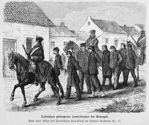 | Keywords: Die Gartenlaube (1871) b 129.jpg 129 130 Die Gartenlaube Franco-Prussian War Prisoners of war in art Hermann Knackfuß ImageNote 1 355 1491 1244 122 1941 1626 2 Transport gefangener Franctireurs bei Rimogue Nach einer Skizze des Freiwilligen Knackfuß im Husaren-Regiment Nr 15 ImageNoteEnd 1 |