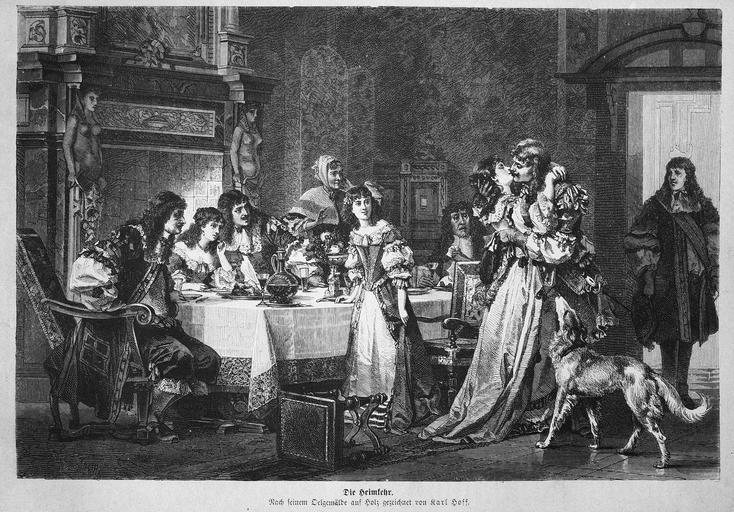 | Keywords: Die Gartenlaube (1872) b 337.jpg 337 338 Creator Karl Hoff Die Heimkehr Nach seinem Oelgemälde auf Holz gezeichnet von Karl Hoff <br />Bild von Seite 337 der Zeitschrift Die Gartenlaube Die Heimkehr the homecoming after Karl Hoff <br />Image from page 337 of journal Die Gartenlaube 1872 Karl Hoff Kisses in paintings Returning home in art |