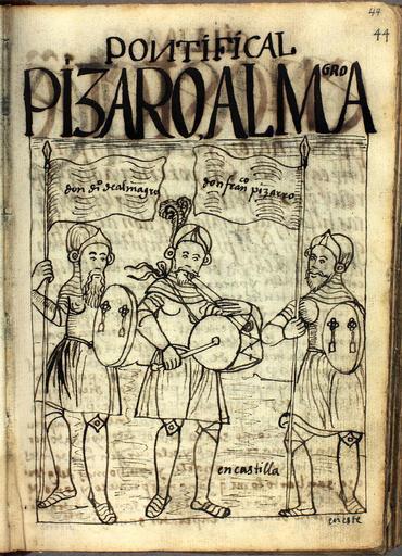 | Keywords: Diego de Almagro y Francisco Pizarro en Castilla.jpg es PIZARO ALMAGRO / don Diego de Almagro / don Francisco Pizarro / en Castilla http //www kb dk/permalink/2006/poma/44/es/image/ open id2683831 imagesize XL Guaman Poma Nueva corónica y buen gobierno 1615 PD-old-100 Nueva corónica y buen gobierno Diego de Almagro Francisco Pizarro Explorers from Spain | ||||
