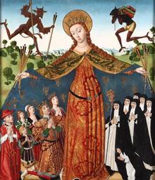 Keywords: Diego de la Cruz, La Virgen de la Misericordia con los Reyes Católicos y su familia. Monasterio de las Huelgas, Burgos.png La obra muestra a los Reyes Católicos Isabel I de Castilla y Fernando II de Aragón junto a la Virgen de la Misericordia y los siguientes personajes El príncipe Juan de Aragón 1478-1497 hijo primogénito de los Reyes Católicos La infanta Isabel de Aragón 1470-1498 hermana del anterior y reina consorte de Portugal La infanta Juana 1479-1555 que llegaría a reinar en Castilla y Aragón como Juana I El cardenal Pedro González de Mendoza 1428-1495 arzobispo de Toledo y canciller mayor de Castilla A la derecha aparecen seis monjas vestidas con el hábito cisterciense y rezando Y junto a ella aparece una abadesa con su báculo que ha sido identificada con la hermana del dicho cardenal Leonor de Mendoza que fue abadesa del monasterio de las Huelgas de Burgos entre 1486 y 1499 ~ 1486 oil on panel Size cm 127 149 Institution Monastery of Santa María la Real de Las Huelgas Burgos Sala capitular del monasterio http //www patrimonionacional es/retratos/obras_principales htm object history exhibition history credit line accession number http //www patrimonionacional es/retratos/obras_principales htm PD-old-100 Paintings of Virgin of Mercy in Spain 15th-century paintings of Virgin of Mercy 15th-century donor portraits with Madonna Catholic Monarchs Ferdinand II of Aragon in paintings Paintings of Isabella I of Castile John Prince of Asturias Elisabeth of Spain Joanna of Castile in portrait paintings Pedro González de Mendoza Diego de la Cruz Paintings in the monastery of Las Huelgas Burgos Sala capitular del monasterio de las Huelgas de Burgos 1480s paintings Titivillus Ornamental textiles in art |