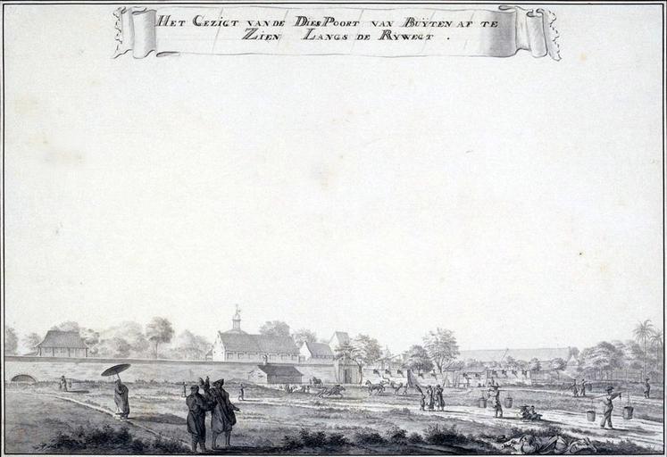 | Keywords: Diest-Gate.jpg -6 136733 106 811704 8 en View of the Diestpoort see from the south To the right slaves bathe horses in the river A bastion on a small island in the river in front of the gate was built to protect against a possible threat from the nearby Chinese quarter The Chinese population was rounded up and concentrated here in 1740 in the aftermath of the Chinese uprising and the massacre that followed The area between the walls and the Chinese quarter was purposely left unoccupied To the right of centre two imams take a stroll accompanied by a slave boy bearing a parasol Cf National Library of Indonesia inv nr A 08 The roof of the inner hospital can be seen to the right of the picture The tower of the New Church is visible at center View of the Diestpoort - 1770-1774 drawing pen and brush 35 5 x 52 cm - Het Gezigt van de DiesPoort van Buÿten af te Zien Langs de Rÿwegt voc banderole / cartouche / ornamentation survey / view fortification fauna church / parsonage person gate Bruin M de en B Kist Johannes Rach 1720-1783 Artist in Indonesia and Asia p 36 2011-04-11 Atlas of Mutual Heritage - Netherlands Johannes Rach PD-Art Uploaded with UploadWizard History of Jakarta Kota Tua |