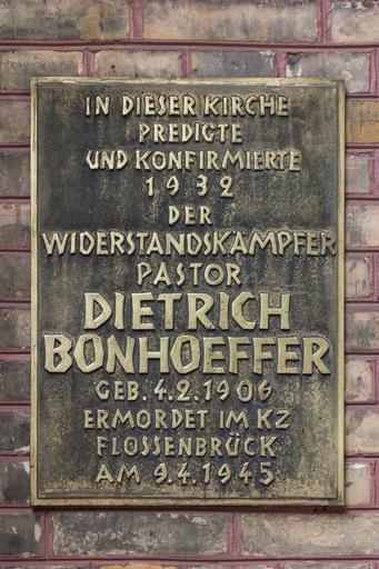 | Keywords: Dietrich Bonhoeffer Gedenktafel Zionskirche Berlin.jpg Dietrich Bonhoeffer an der Zionskirche in Berlin-Mitte Dietrich Bonhoeffer at the Zionskirche in Berlin-Mitte 2014-08-17 12 56 30 own Ansgar Koreng other fields 1 inscription inscription IN DIESER KIRCHE<br/>PREDIGTE<br/>UND KONFIRMIERTE<br/>1932<br/>DER<br/>WIDERSTANDSKÄMPFER<br/>PASTOR<br/>DIETRICH<br/>BONHOEFFER<br/>GEB 4 2 1906<br/>ERMORDET IM KZ<br/>FLOSSENBRà CK<br/>AM 9 4 1945 de QualityImage self cc-zero Uploaded with UploadWizard Zionskirche Berlin Plaques of Dietrich Bonhoeffer Plaques in Berlin-Mitte Taken with Canon EOS 500D Photos by User Code Pictures of Berlin by User Code Taken with Canon EF-S 18-55mm f/3 5-5 6 IS STM Quality images of Berlin Quality images by User Code Quality images of plaques Quality images of monuments and memorials in Germany |