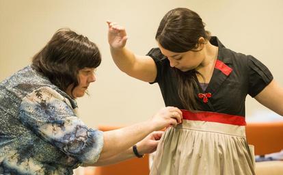 Keywords: lbj library lbjlibrary austin texas lyndon johnson lyndonjohnson president tx usa Assistant stage manager Teresa Morrow applies finishing touches to a costume worn by actor Sara Billeaux. Pollyanna Theatre Company, a resident theatrical company of the Long Center for Performing Arts in Austin, revived its highly successful 2014 inaugural run of the civil rights-focused play, Liberty! Equality! And Fireworks! by Gregory S. Perrin for a performance at the LBJ Presidential Library on Thursday, February 18, 2016. The special production was free, open to the public, and performed in the LBJ Auditorium. Liberty! Equality! And Fireworks! is set in a history museum. The play's characters, a group of 4th grade students (portrayed by adult professional actors), learn about the U.S. civil rights movement when legendary images from the 1960s come to life and talk to the children. These characters entertain and enlighten, taking children on a fascinating journey through history. LBJ Library photo by Jay Godwin 02/18/2016 Assistant stage manager Teresa Morrow applies finishing touches to a costume worn by actor Sara Billeaux. Pollyanna Theatre Company, a resident theatrical company of the Long Center for Performing Arts in Austin, revived its highly successful 2014 inaugural run of the civil rights-focused play, Liberty! Equality! And Fireworks! by Gregory S. Perrin for a performance at the LBJ Presidential Library on Thursday, February 18, 2016. The special production was free, open to the public, and performed in the LBJ Auditorium. Liberty! Equality! And Fireworks! is set in a history museum. The play's characters, a group of 4th grade students (portrayed by adult professional actors), learn about the U.S. civil rights movement when legendary images from the 1960s come to life and talk to the children. These characters entertain and enlighten, taking children on a fascinating journey through history. LBJ Library photo by Jay Godwin 02/18/2016