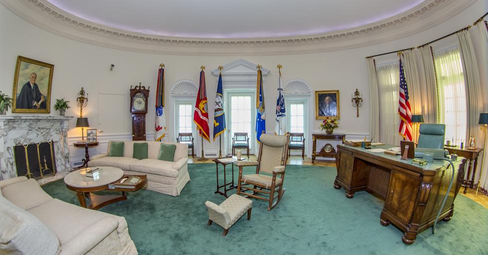 | Keywords: architecture building The Oval Office replica at the LBJ Presidential Library. This famous room from the West Wing of the White House has been reproduced in our library at a 7/8th scale. The Oval Office looks exactly as it did during LBJ's White House years, including the desk he used beginning in his Senate days through the White House years, rocking chair, telephone system, and the teletype machines and three televisions that kept him up to date on the news. Photo taken with a fisheye lens. LBJ Library photo by Jay Godwin 07/13/2016 The Oval Office replica at the LBJ Presidential Library. This famous room from the West Wing of the White House has been reproduced in our library at a 7/8th scale. The Oval Office looks exactly as it did during LBJ's White House years, including the desk he used beginning in his Senate days through the White House years, rocking chair, telephone system, and the teletype machines and three televisions that kept him up to date on the news. Photo taken with a fisheye lens. LBJ Library photo by Jay Godwin 07/13/2016 |