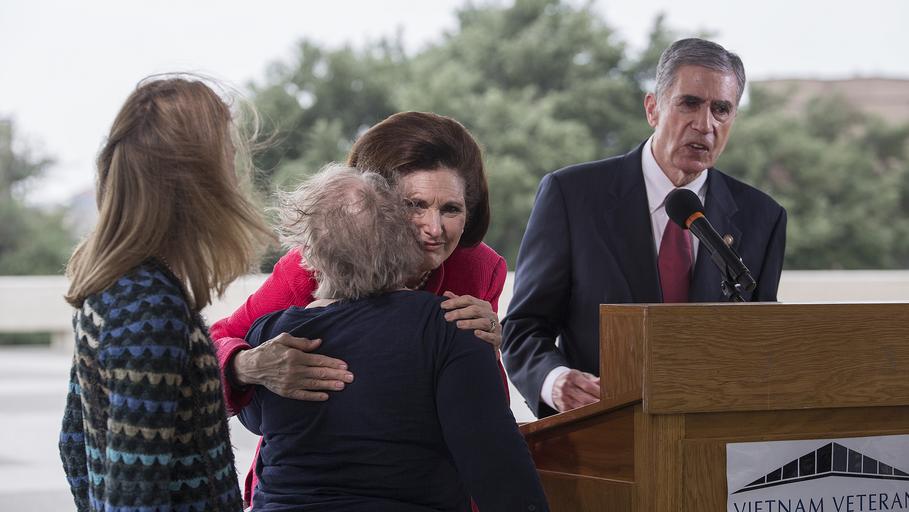 | Keywords: outdoor Lynda Johnson Robb, daughter of President Lyndon Johnson and Lady Bird Johnson, hugs her friend Sally Griffis of Peachtree City, Georgia on Tuesday April 26, 2016 at the LBJ Presidential Library during its Vietnam War Summit. Griffis' husband, Marine Capt. William "Bill" Griffis, III, was killed during the Vietnam War on January 24, 1970. At left is the Griffises' daughter, Mitty Griffis Mirrer of Providence, Rhode Island, who was born just a few hours before the official notification of the death of her father. At right is Charles Robb, a Vietnam veteran, former governor and U.S. senator from Virginia, and Lynda Robb's husband. The Robbs recognized the contributions of Vietnam War veterans in a ceremony outside the LBJ Presidential Library as part of the library's three-day Vietnam War Summit. Each veteran at the ceremony received a Vietnam veteran lapel pin engraved on the back with “A Grateful Nation Thanks and Honors You.” The LBJ Presidential Library is hosting the Vietnam War Summit to discuss and reflect upon the lessons and legacy of the 50-year-old war. The Vietnam War Summit runs from April 26-April 28 at the LBJ Library. LBJ Library photo by Nick Ut 04/26/2016. Lynda Johnson Robb, daughter of President Lyndon Johnson and Lady Bird Johnson, hugs her friend Sally Griffis of Peachtree City, Georgia on Tuesday April 26, 2016 at the LBJ Presidential Library during its Vietnam War Summit. Griffis' husband, Marine Capt. William "Bill" Griffis, III, was killed during the Vietnam War on January 24, 1970. At left is the Griffises' daughter, Mitty Griffis Mirrer of Providence, Rhode Island, who was born just a few hours before the official notification of the death of her father. At right is Charles Robb, a Vietnam veteran, former governor and U.S. senator from Virginia, and Lynda Robb's husband. The Robbs recognized the contributions of Vietnam War veterans in a ceremony outside the LBJ Presidential Library as part of the library's three-day Vietnam War Summit. Each veteran at the ceremony received a Vietnam veteran lapel pin engraved on the back with “A Grateful Nation Thanks and Honors You.” The LBJ Presidential Library is hosting the Vietnam War Summit to discuss and reflect upon the lessons and legacy of the 50-year-old war. The Vietnam War Summit runs from April 26-April 28 at the LBJ Library. LBJ Library photo by Nick Ut 04/26/2016. |