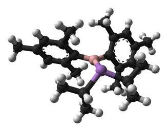 | Keywords: Diisopropylarsinodimesitylborane-from-xtal-3D-balls.png Ball-and-stick model of an arsinoborane molecule diisopropylarsinodimesitylborane Mes<sub>2</sub>B-As iPr <sub>2</sub> as found in the crystal structure Single-crystal X-ray diffraction data from http //dx doi org/10 1016/0022-328X 93 80411-4 J Organomet Chem 1993 455 C1-C2 Model constructed in http //www crystalmaker com/ CrystalMaker 8 1 Image generated in http //accelrys com/products/discovery-studio/visualization/discovery-studio-visualizer html Accelrys DS Visualizer Own 2009-05-03 Ben Mills Benjah-bmm27 Images by Ben Mills Ball-and-stick models Boron-arsenic compounds Mesityl compounds Isopropyl compounds |