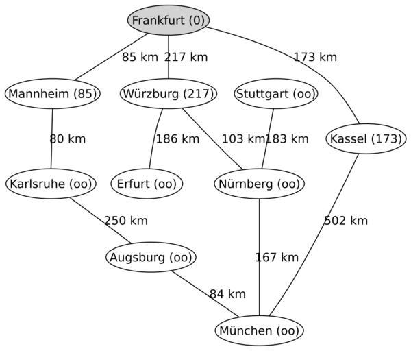Keywords: DijkstraStep01.svg First Step of a run of Dijkstra's algorithm on a map of Germany see Image MapGermanyGraph svg Created by de Benutzer Regnaron with graphviz Dijkstra's algorithm