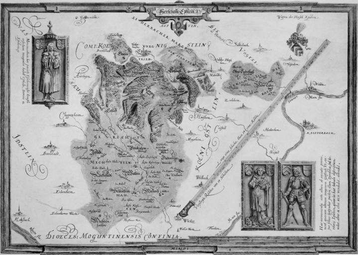 | Keywords: Dilich-Eppstein4.jpg Landtafel der Herrschaft Eppstein Generaltafel Entstanden 1607/09 Gr 33 8 × 48 2 cm Titel als Kartusche oben im Rahmen žHerschafft Epstein Abbildungen drei Grabsteine aus der Kirche in Eppstein oben links Engelbrecht von E 1494 unten rechts Adolf von E erwählter Bischof von Speyer 1434 und Gottfried von E 1437 Wappen der Herren von Eppstein drei rote Sparren in Silber auf dem Helm umgeschlagener Hut mit Pfauenfederbusch besteckt Farbgebung Feld braungelb mit hellgrünlichem Rand Wald grün mit goldenen Tupfen außerhalb blau; Gewässer olivgrün; außerhalb der Herrschaft Eppstein alle Ortschaften auf weißem Grund; Grabsteine oben links rot mit grauer Figur unten rechts braun mit bläulichem Schimmer; im stahl- zum Teil grünblauen Rahmen oben zwei gold-rote Verzierungen unter dem gelblichen Titelschildchen ein grüner Stein in goldener Fassung Maßstab 1 63000 Edmund E Stengel Hrsg Wilhelm Dilichs Landtafeln hessischer Ämter zwischen Rhein und Weser Elwert Marburg 1927 Marburger Studien zur älteren deutschen Geschichte 1609 Creator Wilhelm Dilich PD-old-100 Wilhelm Dilich Old maps of Hesse Coats of arms on maps Coats of arms of Eppstein family |