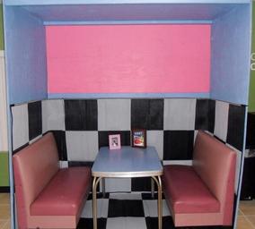 Keywords: diner booth pink teal checkered malt milk shake back future past history