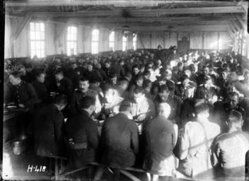 Keywords: blackandwhite monochrome auditorium people crowd black and white Soldiers sitting down to dinner at the New Zealand Infantry Base Depot in Etaples, France, during World War I. Photograph taken 13 Jan 1918 by Henry Armytage Sanders. Inscriptions: Inscribed - Photographer's title on negative -bottom left: H418. Quantity: 1 b&w original negative(s). Physical Description: Dry plate glass negative 4.75 x 6.5 inches Dining time at the New Zealand Base Depot in France. Royal New Zealand Returned and Services' Association :New Zealand official negatives, World War 1914-1918. Ref: 1/2-013045-G. Alexander Turnbull Library, Wellington, New Zealand. natlib.govt.nz/records/23155004 Soldiers sitting down to dinner at the New Zealand Infantry Base Depot in Etaples, France, during World War I. Photograph taken 13 Jan 1918 by Henry Armytage Sanders. Inscriptions: Inscribed - Photographer's title on negative -bottom left: H418. Quantity: 1 b&w original negative(s). Physical Description: Dry plate glass negative 4.75 x 6.5 inches Dining time at the New Zealand Base Depot in France. Royal New Zealand Returned and Services' Association :New Zealand official negatives, World War 1914-1918. Ref: 1/2-013045-G. Alexander Turnbull Library, Wellington, New Zealand. natlib.govt.nz/records/23155004