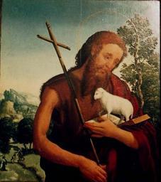 Keywords: Diogo de Contreiras - São João Baptista.jpg pt Em primeiro plano ligeiramente deslocado para a direita São João Baptista que aparece como um homem de meia idade de barba e cabelo castanho vestindo uma túnica de pele castanha e colocado sobre o ombro esquerdo um manto vermelho No braço esquerdo segura um livro aberto sobre o qual está um pequeno cordeiro branco Na mão direita segura uma cruz feita de canas Do lado esquerdo em segundo plano está representada a cena do baptismo de Cristo e mais ao fundo uma cidade Do lado direito uma árvore Toda esta parte da pintura está pintada em tons de azul e verde constratando com a personagem principal que se destaca sobre este fundo 2012-12-18 00 43 27 http //www matriznet imc-ip pt/ Creator Diogo de Contreiras PD-old-100 Diogo de Contreiras Uploaded with UploadWizard Images from the Instituto dos Museus e da Conservação Paintings of John the Baptist in Portugal Paintings in the Museu de Évora |