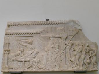 | Keywords: Dionysos and Ikarios - Farnese Collection - MANN 6713 - LDR 1322.JPG it Rilievo in marmo con Dioniso ed Ikario facente parte della Collezione Farnese non della Collezione Borgia oggi al Museo Archeologico Nazionale di Napoli inv 6713 Il rilievo di cui sono note altre repliche in diversi musei del mondo mostra Dioniso come vecchio ebbro sostenuto da un satirello e seguito da un corteo di Satiri e Menadi che arriva in casa di Ikarios disteso su di una kline in compagnia di una donna <br> attenzione In S De Caro Il Museo Archeologico Nazionale di Napoli Napoli 1994 il rilievo è attribuito erroneamente alla Collezione Borgia derivato dall'inventario generale dove è segnato in matita Borgia own DenghiùComm 2010-11-02 <gallery> File Poet Dionysos Louvre Ma1606 jpg in the Louvre File Bacchus and Attendants Visiting Icarus jpg in the British Museum File Arte romana dioniso che visita l'attore ateniese ikarios da efeso 01 JPG in Izmir from Ephesus </gallery> Ancient Roman reliefs from the Farnese Collection now in Naples 6713 Icarius Athens 6713 Reliefs of Dionysos 6713 |