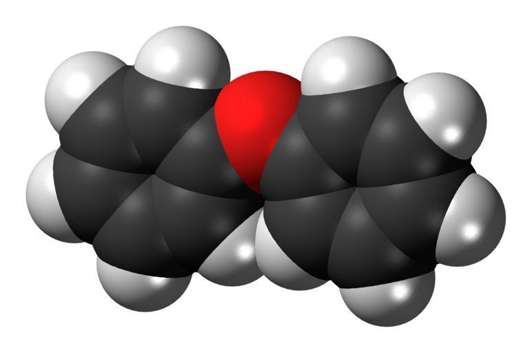 | Keywords: Diphenyl ether 3D spacefill.png Space-filling model of the diphenyl ether molecule also known as phenoxybenzene Colour code 505050 Carbon C black<br> F0F0F0 Hydrogen H white<br> F51E1E Oxygen O red<br> 2011-06-27 own DS Visualizer Jynto talk Ball-and-stick version cc-zero Images by Jynto Space-filling models Diphenyl_ether |