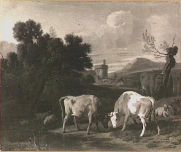 | Keywords: Dirck van Bergen 002.jpg Artwork Q17319694 Creator Dirck van Bergen between 1660 1690 Oil on canvas cm 37 48 Institution Rijksmuseum Amsterdam SK-A-39 Landschap met vechtende stieren 1660-1690 22398 Zuidelijk landschap met vechtende stieren 1660-1710 object history ProvenanceEvent 1815 purchase LangSwitch das the le het Rijksmuseum Amsterdam Amsterdam exhibition history credit line D V D Bergen signature bottom right ~ accession number SK-A-39 www rkd nl http //www rkd nl Home http //www rkd nl/rkddb/dispatcher aspx action search database ChoiceImages search priref 22398 Info http //www rkd nl/rkddb/ 28S 284hytyz3ufkkwk01su3fso3gi 29 29/photo aspx maxphotos 2 Pic PD-Art Oil paintings of bulls 17th-century landscape paintings Dirck van Bergen 1660 Paintings by Dirck van Bergen in the Rijksmuseum Amsterdam Bergen Dirck Van |