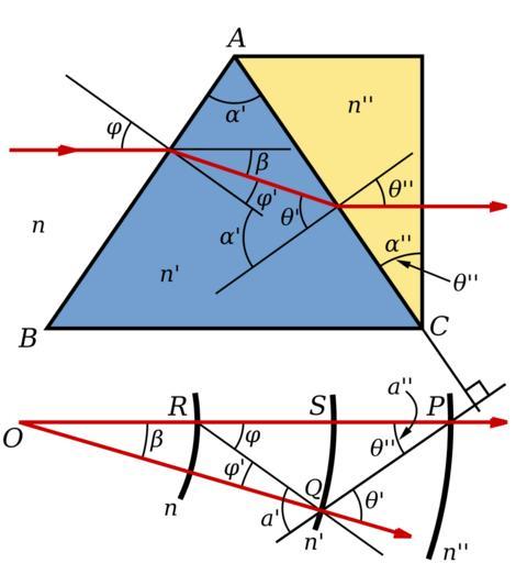 | Keywords: Direct-vision Prism.svg direct-vision prism Crown glass is shown in blue flint in yellow As this kind of prism is dispersive other colours will not emerge normal to the end surface A graphic ray tracing method is shown Three arcs are drawn with radii proportional to the refractive indices of the medium crown and flint and a line perpendicular to AC through P Own Inductiveload 2009-02-05 Optics diagrams Amici prisms Direct-vision prisms | ||||