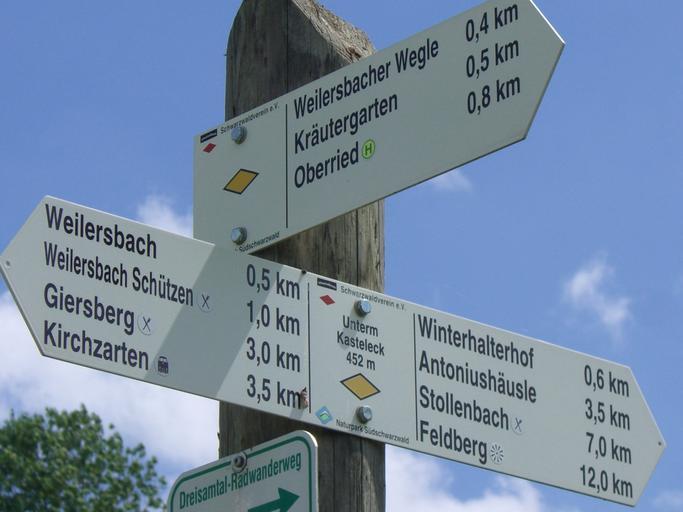Keywords: directory signposts shield direction marking arrow signpost waymarks migratory character hiking trails note sky blue black forest