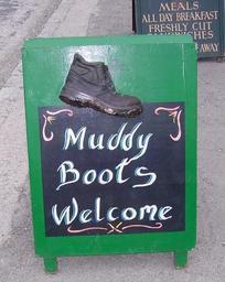 Keywords: Dirty boots welcome in Malham.JPG view of Malham in the Yorkshire Dales United Kingdom 2006-08-05 own Immanuel Giel Malham Boots Signs in North Yorkshire Welcome signs in England Mud Footwear of the United Kingdom