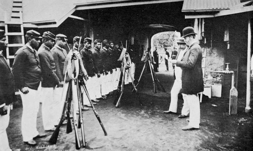 | Keywords: Disarming Liliuokalani's Household Guards.jpg en Queen Liliuokalani's Household Guard being disarmed by Col John H Soper following the overthrow of the monarchy in January 1893 The Hawaiians stacked arms turned over equipment and list to The Authority notice read by Colonel Soper afterwards General While Captain of the Guard Samuel Nowlein looks toward the camera beside Soper cite book Albert Pierce Taylor Under Hawaiian Skies A Narrative of the Romance Adventure and History of the Hawaiian Islands Board of Education of the Hawaiian Kingdom 1922 http //books google com/books id _2CmsAMr75wC http //books google com/books id _2CmsAMr75wC pg PA268-IA3 v onepage q f false Page 268 J J Williams 1893-01 Royal Guards of Hawaii John Harris Soper Samuel Nowlein 1893 coup d'etat in Hawaii Males with rifles James J Williams Military in Hawaii PD-US 1926 |