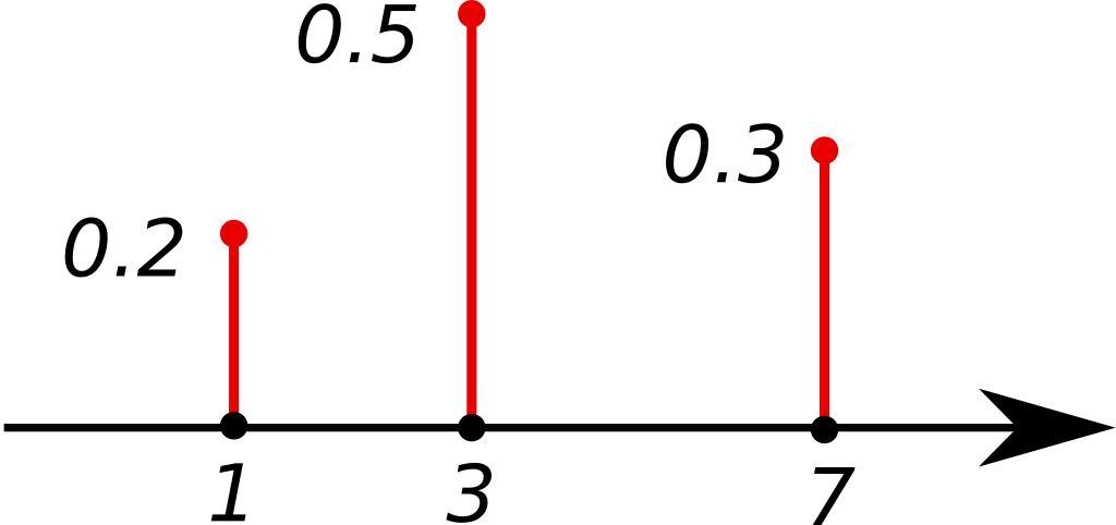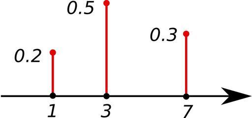 Keywords: Discrete probability distrib.svg مثال لبيان دالة توزيع في حالة متغير منقطع The probability mass function of a discrete probability distribution The probabilities of the singletons 1 3 and 7 are respectively 0 2 0 5 0 3 A set not containing any of these points has probability zero The graph of a probability mass function All the values of this function must be non-negative and sum up to 1 Probabilitate banakuntza diskretu bateko probabilitate funtzioaren irudizko adierazpidea balio posibleak 1 3 7 dagozkien probabilitateekin batera agertzen dira تابع جرم احتمال توزیعی گسسته احتمال وقوع هر یک از مقادیر ۱، ۳ و ۷ به ترتیب برابر با ۰ ۲، ۰ ۵ و ۰ ۳ است احتمال وقوع مجموعه ای که این سه مقدار عضو آن نباشد صفر است La loi de probabilité d'une variable aléatoire discrète Le support est composé des singletons 1 3 et 7 et les probabilités associées sont respectivement 0 20 0 50 et 0 30 Un ensemble ne contenant pas ces points se voit attribuer une probabilité nulle פונקציית הסתברות ש התפ גות בדידה ההסתברות ש היחידוני 1 3 ו- 7 היא 0 2 0 5 ו-0 3 בהתאמה כ קבוצה שאינה מכי ה פחות אחד מערכי א ו היא בע ת הסתברות שווה אפס 離散確率分布の確率質量関数 単集合 1 3 7 の確率は れぞれ 0 2 0 5 0 3 これらの点を含まない集合の確率はゼロである Funkcja opisująca przykładowy dyskretny rozkład prawdopodobieństwa Prawdopodobieństwa przyjęcia przez zmienną wartości 1 3 i 7 wynoszą odpowiednio 0 2 0 5 0 3 Inne wartości mają zerowe prawdopodobieństwo Bir ayrık olasılık dağılımı için olasılık kütle fonksiyonu Tek veri değerleri olan 1 3 ve 7 icin olasılık değerleri 0 2 0 5 0 3 olarak bulunur Bu degerleri kapsamayan bir veri seti icin olasılık sıfır olur Bir olasılık kütle fonksiyonu için grafik gösterim Bu fonksiyonun her değeri negatif olmayıp tüm değer toplamları tam olarak bire eşittir Hàm khối xác suất của một phân phối xác suất r i rạc Xác suất của các giá trị đơn singleton 1 3 và 7 lần lượt là 0 2 0 5 0 3 Một tập hợp không chứa giá trị nào trong các điểm này có xác suất bằng 0 Đồ thị của hàm khối xác suất Mọi giá trị của hàm phải không âm và có tổng bằng 1 个概率质量函数的图像 函数的 必须 负,且 和为1 Own Oleg Alexandrov other versions Commons Deletion requests/File Discrete probability distrib png Oleg Alexandrov Discrete probability theory Files by User Oleg Alexandrov from en wikipedia |
