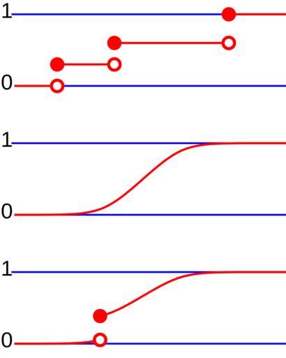 | Keywords: Discrete probability distribution illustration.svg 2px 3 valign center This is all three examples in one image but you may use these images separately Все т и п име а на одной ка тинке но изоб ажения доступны и по отдельности 392px Discrete distribution - 392px Normal distribution - 392px Mixed distribution From top to bottom the cumulative distribution function of a discrete probability distribution continuous probability distribution and a distribution which has both a continuous part and a discrete part Cumulative distribution functions are examples of càdlàg functions Fonctions de répartition d'une variable discrète d'une variable diffuse et d'une variable avec atome mais non discrète בשרטוט הע יון מוצגת פונקציית ההצטברות ש ההתפ גות הבדידה ש ה ש ושה ערכי אפשריי 1 3 ו- 7 בהסתברות 0 2 0 5 ו-0 3 בהתאמה השרטוט האמצעי מציג את פונקציית ההצטברות ש התפ גות רציפה עובדה שניתן הסיק בש רציפות הפונקציה ע כ הטווח 0 1 השרטוט התחתון מציג פונקציית הצטברות ש התפ גות שהינה רציפה בח קה ובדידה בח קה Az eloszlásfüggvények például càdlàg függvények Le funzioni di ripartizione sono un esempio di funzioni càdlàg 上から順に 離散確率分布 続確率分布 続部分と離散部分がある確率分布の累積分布関数 산 확률 분포 연속 확률 분포 산적 분과 연속적 분 모두 존재하는 분포에 각각 누적 분포 함수 Od góry dystrybuanta pewnego dyskretnego rozkładu rozkładu ciagłego oraz rozkładu mającego zarówno ciągłą jak i dyskretną część Одозго на доле функција асподеле диск етне случајне п оменљиве неп екидне случајне п оменљиве и случајне п оменљиве која има и неп екидне и диск етне делове From top to bottom the cumulative distribution function of a discrete probability distribution continuous probability distribution and a distribution which has both a continuous part and a discrete part Yukarıdan aşağıya doğru bir ayrık olasılık dağılımı için bir sürekli olasılık dağılımı için ve hem sürekli hem de ayrık kısımları bulunan bir olasılık dağılımı için yığmalı olasılık fonksiyonu sten alta doğru Bir aralıklı dağılım için bir sürekli dağılım için ve hem sürekli bir kısmı hem de aralıklı bir kısmı bulunan bir dağılım için yığmalı dağılım fonksiyonları Зве ху вниз функція озподілу для диск етного озподілу ймові ностей для непе е вного озподілу та для озподілу що містить диск етну та непе е вну частини Từ trên xuống dưới hàm phân phối tích tũy của một phân phối xác suất r i rạc phân phối xác suất liên tục và một phân phối có cả một phần liên tục và một phần r i rạc Hàm phân bố tích lũy là một ví dụ của hàm số càdlàg s from File Discrete_probability_distribution_illustration png 2010-07-31 Incnis Mrsi <span class signature-talk >talk</span> other versions see above Cumulative distribution functions Discrete probability theory |