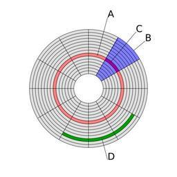 | Keywords: Disk-structure.svg Disk structure showing a track A a sector B and a sector of track C and a cluster of sectors D Estructura de disco que muestra <br> A una pista roja <br> B un sector geométrico azul <br> C un sector de una pista magenta <br> D y un grupo de sectores o clúster verde Own 2007-03-23 MistWiz this work is released by it's author in the Public Domain Computer storage media Cluster diagrams | ||||