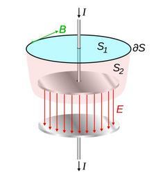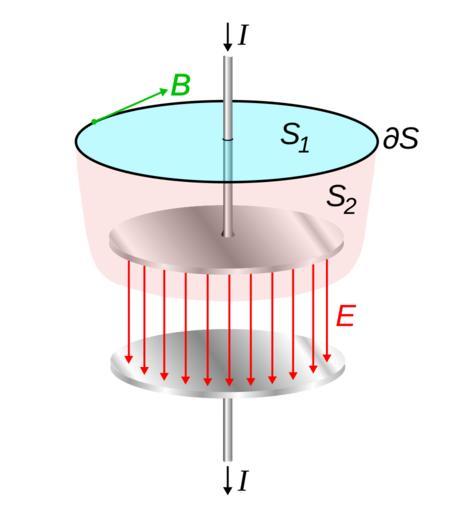 Keywords: Displacement current in capacitor.svg Diagram of a widely used example demonstrating need for the displacement current term in Maxwell's equations The diagram shows a capacitor being charged by current <math>I\ </math> flowing through a wire which creates a magnetic field <math>\mathbf B \ </math> around it The magnetic field is found from Ampere's law <math>\oint_ \partial S \mathbf B \cdot d\mathbf l \mu_0 \int_S \mathbf J + \epsilon_0 \frac \partial \mathbf E \partial t \cdot d\mathbf S \ </math> The equation says that the integral of the magnetic field <math>\mathbf B \ </math> around a loop <math>\partial S\ </math> is equal to the current <math>\mathbf J \ </math> through any surface spanning the loop plus a term depending on the rate of change of the electric field <math>\mathbf E \ </math> through the surface This term the second term on the right is the displacement current For applications with no time varying electric fields unchanging charge density it is zero and is ignored However in applications with time varying fields such as circuits with capacitors it is needed as shown below Any surface intersecting the wire such as <math>S_1\ </math> has current <math>I\ </math> passing through it so Ampere's law gives the correct magnetic field <math>B \frac \mu_0 I 2 \pi r \ </math> But surface <math>S_2\ </math> spanning the same loop that passes between the capacitor's plates has no current flowing through it so without the displacement current term Ampere's law gives <math>B 0\ </math> So without the displacement current term Ampere's law fails; it gives different results depending on which surface is used which is inconsistent The 'displacement current' term provides a second source for the magnetic field besides current; the rate of change of the electric field <math>\mathbf E \ </math> Between the capacitor's plates the electric field is increasing so the rate of change of electric field through the surface <math>S_2\ </math> is positive and its magnitude gives the correct value for the field field <math>\mathbf B \ </math> found above James Clerk Maxwell added the displacement current term to Ampere's law around 1861 Example taken from http //www feynmanlectures info/ Feynman Richard; Robert Leighton; Matthew Sands 1964 The Feynman Lectures on Physics Vol 2 Addison-Wesley USA p 18-4 using slightly different terminology Own 2008-11-10 Chetvorno I Chris Burks Chetvorno the author release this work into the public domain for any use whatever Field diagrams James Clerk Maxwell Electric current