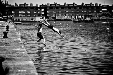 Keywords: dive plunge water jump fun summer refreshing lake urban plunging swimming youth active activity holidays vacations black and white diving swan dive people boy girl buildings city