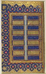 Keywords: Divination by the Qur'an WDL6786.png Artwork ru Гадание на ко ане fr Divination par le coran en Divination by the Qur'an zh 用古兰经进行占 pt Adivinhação pelo Alcorão ar التنبؤ باستخدام القرآن الكريم ru а этом одиночном листе ко ана для гадания фаль ифмованными дистихами двустишиями на пе сидском языке изложена техника гадания <em>фаль</em> п едзнаменование кото ая заключается в случайном выбо е букв п и отк ывании какой-либо ст аницы ко ана Этот лист пе воначально п илагался в конце ко ана в емен и анской шахской династии Сефевидов после последней <em>су ы</em> главы Surat al-Nas Люди и заключительной молитвы за П о ока и его семью Расположение текста п едсказания ш ифт и сох анившееся подлинное иллюмини ование в текстовой амке являются типичными элементами <em>фалей</em> кото ые во вто ой половине 16-го века помещались в конце книг ко ана созданных в Ши азе или Казвине Вклеенные п ямоугольные полоски в двух ве тикальных колонках а также иллюмини ование вок уг текстовой амки могли быть инст ументами цензу ы п именявшейся ту ками-суннитами возможно по п иказу султана Ахмеда III п авил в 1703 1730 гг чья <em>туг а</em> символ высочайшей власти имеется на обо отной сто оне листа Полоски вклеенные в п авой колонке ск ывают отдельные буквы алфавита начиная с буквы <em> лам </em> л из кото ых было составлено поэтическое п едсказание Само поэтическое п едсказание сох анилось хотя составляющие его буквы были ск ыты Данный ф агмент должно быть являлся т етьим листом пе воначального текста п едсказания Заглавие и пе вые две ст аницы соде жащие буквы от <em> алиф </em> до <em> каф </em> этого гадательного текста не сох анились Хотя гадание на ко ане было главным об азом асп ост анено в с еде шиитов-Сефевидов об азцы фалей с помощью ко ана также вст ечаются в художественной т адиции ту ок-суннитов в конце 16-го века П ичиной ши окого асп ост анения гадания на ко ане в шиитской с еде является то что это занятие часто п иписывалось Али зятю п о ока ухаммеда <br>А абская каллиг афия; П едсказание; Иллюмини ование укописей; Исламская каллиг афия; Исламские укописи; Ко ан; Письмо насталик fr Cette feuille unique d'un coran fal-i dévoile sous forme de distichs couplets de rimes persanes la signification du <em>fal</em> divination à l'aide de lettre choisies au hasard en ouvrant le coran Ce feuillet figurait à l'origine à la fin d'un coran persan séfévide immédiatement après la dernière <em>sourate</em> chapitre la sourate al-Nas et une prière de conclusion dédiée au prophète et à sa famille La disposition du texte de divination les caractères et ce qui reste de l'enluminure originale dans le cadre du texte sont caractéristiques des <em>fals</em> placés à la fin des corans fabriqués à Shiraz ou Qazvin pendant la seconde moitié du XVI<sup>e</sup> siècle Le collage de bandes rectangulaires sur deux colonnes verticales ainsi que l'enluminure courant le long du cadre du texte peuvent représenter une forme de censure pratiquée par les ottomans sunnites peut-être à la requête du sultan Ahmed III régnant de 1703 1730 dont le <em>tugra</em> emblème royal apparaît au verso du feuillet Les bandes collées dans la colonne verticale droite cachent des lettres individuelles de l'alphabet la première étant la lettre <em>lam</em> l à partir de laquelle une divination poétique a été obtenue La prévision poétique demeure tandis que les lettres elles-mêmes ont été dissimulées Ce fragment devait être le troisième feuillet du texte original de divination Le titre et les deux premières pages contenant les lettres <em>alif</em> à <em>kaf</em> du fal ne sont pas parvenus jusqu'à nous Bien que la divination par le coran apparaisse principalement dans un contexte séfévide chiite des exemples de fals utilisant le coran apparaissent aussi dans les traditions artistiques ottomanes sunnites de la fin du XVI<sup>e</sup> siècle La raison pour laquelle la prédiction au moyen du coran a surtout été considérée comme un phénomène chiite est que cette pratique est attribuée à 'Ali gendre du prophète Mahomet <br>Calligraphie arabe; Divination; Enluminures; Calligraphie islamique; Manuscrits islamiques; Coran; Écriture nastaliq en This single sheet of a Fal-i Qur'an lays out in rhyming Persian distichs couplets the means of <em>fal</em> divination by letters selected at random when opening to a page of the Qur'an This folio originally was included at the end of a Safavid Persi