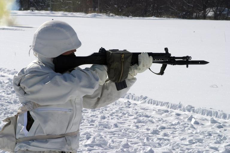 | Keywords: DM-SD-06-06321.JPEG A Japanese Ground Self Defense Force JGSDF Soldier from the 20th Infantry Regiment dressed in white cold-weather gear engages targets down range with his Howa 5 56 mm Type 89 assault rifle during a live fire exercise conducted at the snow covered Ojojibara Maneuver Area of Sendai Japan while participating in Exercise FOREST LIGHT 2004 Forest Light is a bi-lateral training exercise conducted between the US Marine Corps USMC and the JGSDF source http //www dodmedia osd mil/DVIC_View/Still_Details cfm SDAN DMSD0606321 JPGPath /Assets/Still/2006/Marines/DM-SD-06-06321 JPG PD-USGov Type 89 rifle Winter and mountain warfare Forest Light 2004 20th Infantry Regiment Japan JSDF Type 88 helmet |