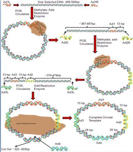 | Keywords: DNA Nanoball Adapter Ligation.png en The Adapter sequences AD1L and AD1R are ligated to the size selected DNA The adapters complement each other and the DNA is circularized A restriction enzyme is added that cleaves the DNA AD2L and AD2R are ligated the DNA is circularized and a restriction enzyme cleaves the DNA AD3L and AD3R are added the DNA is circularized and a type III restriction enzyme is added This cleaves out a 300 - 400bp piece of DNA and AD4 replaces it to complete the circular adapter ligated template DNA own Suspencewl Cc-zero DNA helix-structures Biotechnology |