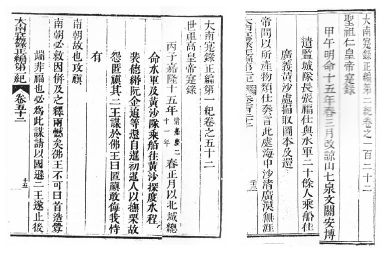 | Keywords: DNTL-HoangSa.png vi Hai trang sách Đại Nam Thực lục Chính biên 大南實錄 bằng chữ Hán do Quốc sử quán triều Nguyễn biên soạn viết về việc Nhà Nguyễn Việt Nam chính thức xác lập chủ quyền trên quần đảo Hoàng Sa với tư cách là một quốc gia gồm 01 trang ở Đệ nhất kỷ quyển 52 và 01 trang ở Đệ nhị kỷ quyển 122 http //www viethoc org/eholdings/HoangSa_TruongSa_HoBachThao_02 pdf Quốc sử quán triều Nguyễn 1820 1890 PD-old Paracel Islands | ||||