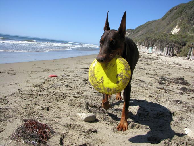 Keywords: doberman dog pet animal purebred frisbee beach fun california sand waves nature outdoors canine playful brown retrieve