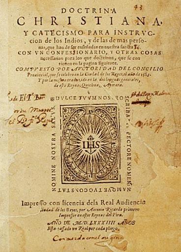 Keywords: Doctrina Christiana.jpg en Title page of the Doctrina christiana y catecismo para instruccion de los Indios the first book printed in South America in Lima 1585 by Antonio Ricardo 2011-06-21 http //www library upenn edu/exhibits/rbm/kislak/religion/lima1 html Anonymous printed by Antonio Ricardo PD-old-100 Uploaded with UploadWizard Title pages Early printed books Antonio Ricardo 1585 books Books from Peru Quechuan languages Aymara |