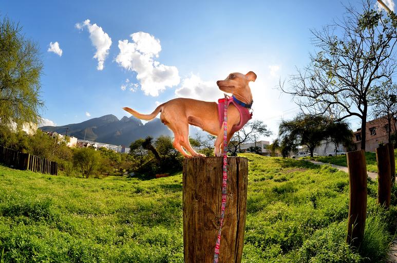 Keywords: dog chihuahua puppy pet animal doggy small breed cute fun tiny mountain sky sun green garden park little funny portrait
