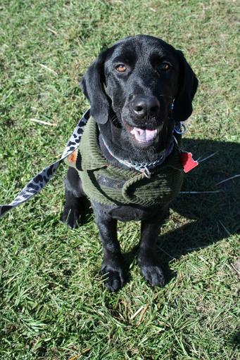 Keywords: dog dog wearing a coat animal coat pet canine cute black fur companion happy sitting outdoors grass sunlight warm