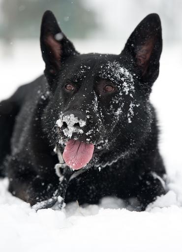 Keywords: dog german shepherd snow flakes canine portrait cute attentive looking laying down