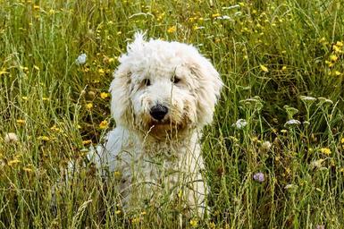 Keywords: dog hybrid animal meadow fur snout white pet portrait