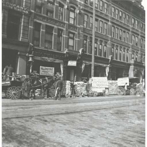 Keywords: Dog sled team and mining supplies stacked on street in front of J F Adams, Alaska Outfitters store, Seattle, Washington, March (KIEHL 235).jpeg Photograph Creator H Ambrose Kiehl On verso of image Dogsled team in front of J F Adams store Alaska outfitters Seattle Text from Kiehl log Front of Adams store March 1898 Album 2 103 Subjects LCTGM Prospecting equipment supplies Subjects LCSH Sled dogs--Washington State --Seattle; Wagons--Washington State --Seattle; Central business districts--Washington State --Seattle Based on an ad in a January 1898 Post-Intelligencer J F Adams was at 907 First Avenue between Marion and Madison site of the present-day Federal Office Building at 909 First Avenue depicted place Seattle Washington 1898 Institution University of Washington UWASH-KIEHL-source accession number kiehl 235 PD-old-auto-1923 1942 Information field Order Number KHL053 Klondike Gold Rush Sled dogs Wagons Downtown Seattle Washington First Avenue Seattle 1898 in Seattle Black and white photographs |