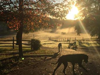 Keywords: dog sunrise morning fog mist summer pet animal nature domestic outdoor sunlight happy canine lifestyle
