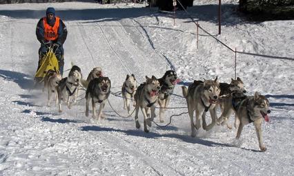 Keywords: dogs race musher competition winter snow ice nature outside huskies canine animals running country countryside
