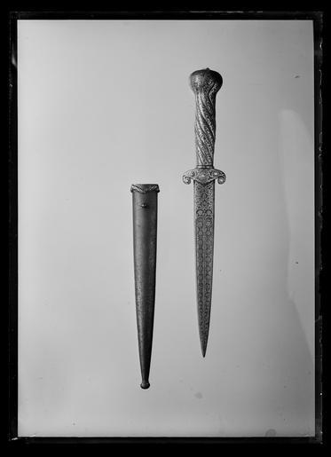 | Keywords: Dolk, Persien, 1500-talets slut, den s.k. Lammska dolken - Livrustkammaren - 68954.tif Dolken är helt av brunerat -mörkanlöpt stål <br/> <br/>Fäste med spiralformig kannelering upptill pungformigt vidgat Kannelyrerna möts strålformigt där de sammanhålls av en cabochonslipad i kista fattad turkos Fattningen omgiven av en blomliknande krage av guld Hela fästet täckt av en yttäckande ornering av påslaget guld med utsparade rankor och bladornament Korta inrullade parerstänger med en slags styrskena på båda sidor med fem turkoser som den på fästet dekoren också lika som den på fästet i övrigt <br/><br/>Klinga rak tvåeggad med yttäckande ornering av påslaget guld med utsparade rankor och bladornament 30 mm från klingbasen på båda sidor två solfjädersliknande fördjupningar och därefter fram till spetsen två bredvid varandra liggande fördjupningar I dessa tre efter varandra liggande utsparade ovaler med persisk inskription i guld Hela klingan med en smal kant utan ornering original caption end other date century 16 turquoise b4 - blankvapen - fästdekor material turkos - steel b12 - blankvapen - fäste och klinga material stål - gold b45 - blankvapen - fäste och klingdekor material guld g 190 size mm 20 klinga size mm 70 klinga size mm 40 size mm 273 LRK Carl Robert Lamm Fredrik Robert Martin Fil dr konstsamlare 1868- Stockholm Sverige Meisterwerke Muhammedanischer Kunst Carl Robert Lamms samling 1993 Hunt for Paradise Court Arts of Safavid Iran 1501-1576 2003-2004 place of origin original filename LN_B01808_004688 42017 inventory number LRK 5360 68954 CC0 Dolk Persien 1500-talets slut den s k Lammska dolken - Livrustkammaren - 68954-negative tif <gallery caption Different images of same object > File Dolk Persien 1500-talets slut den s k Lammska dolken - Livrustkammaren - 77513 tif </gallery> Media contributed by LSH dim-with multiple size templates Dagger images from Livrustkammaren Media contributed by LSH 2013-10 |