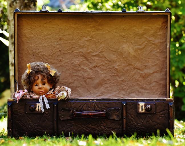 Keywords: doll girl cry farewell cute children funny sweet luggage antique leather old suitcase junk generations travel go away wave
