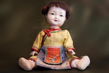Keywords: doll japan japanese sitting old toys kimono yellow colorful hand painted
