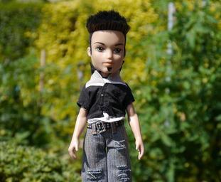 Keywords: doll outdoor figurine male toy plaything kid child bratz puppet white black hair black shirt jeans outside trees boy rocker cool