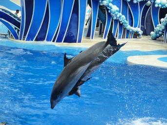 Keywords: dolphins leaping jumping blue water shows zoo fish mammals marine life aquatic friendly intelligent leisure fun activity activities leaps jumps