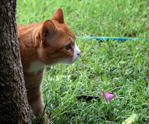 Keywords: domestic cat pet ginger animal cute adorable kitty fur home furry fluffy feline love mammal hunting outdoors summer cautious nature hunt grass garden natural