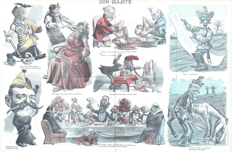 | Keywords: Don Quijote, 6 de diciembre de 1901.jpg es Caricatura 1901-12-06 cite journal Don Quijote X 10 2-3 http //hemerotecadigital bne es/issue vm id 0003815641 page 2 1901-12-6 2254-5581 Creator Manuel Tovar Siles «D HermĂłgenes» PD-Scan PD-old-auto-1923 1935 other versions Caricatures by Manuel Tovar in Don Quijote 1901 cartoons Francisco Silvela caricatures PrĂĄxedes Mateo Sagasta caricatures Segismundo Moret caricatures Salvador Casañas i PagĂšs Antonio Maceo Grajales Catalan nationalism in caricature JuliĂĄn GarcĂa-San Miguel Ăngel UrzĂĄiz Allegory of Hispania Caricatures of personifications of Spain |