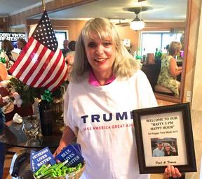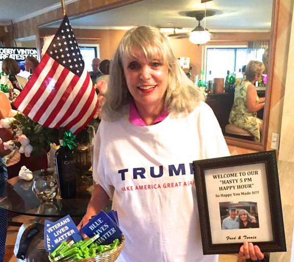 Keywords: Donald Trump Welcome to a Hasty Happy Hour.jpg en Lifelong Democrat Terrie Frankel in living room holding Welcome to Terrie and Fred's Hasty Happy Hour sign; wearing TRUMP Make America Great Again T-shirt A former USO performer during the Vietnam War and big supporter of our military veterans and police Note Blue Lives Matter bumper stickers in photo 2016-06-24 19 25 18 own TwinsofSedona other versions cc-zero Supporters of the Donald Trump presidential campaign 2016 Donald Trump presidential campaign 2016 Donald J Trump Donald J Trump Fans Terrie Frankel Blue Lives Matter Veterans Lives Matter Make America Great Again